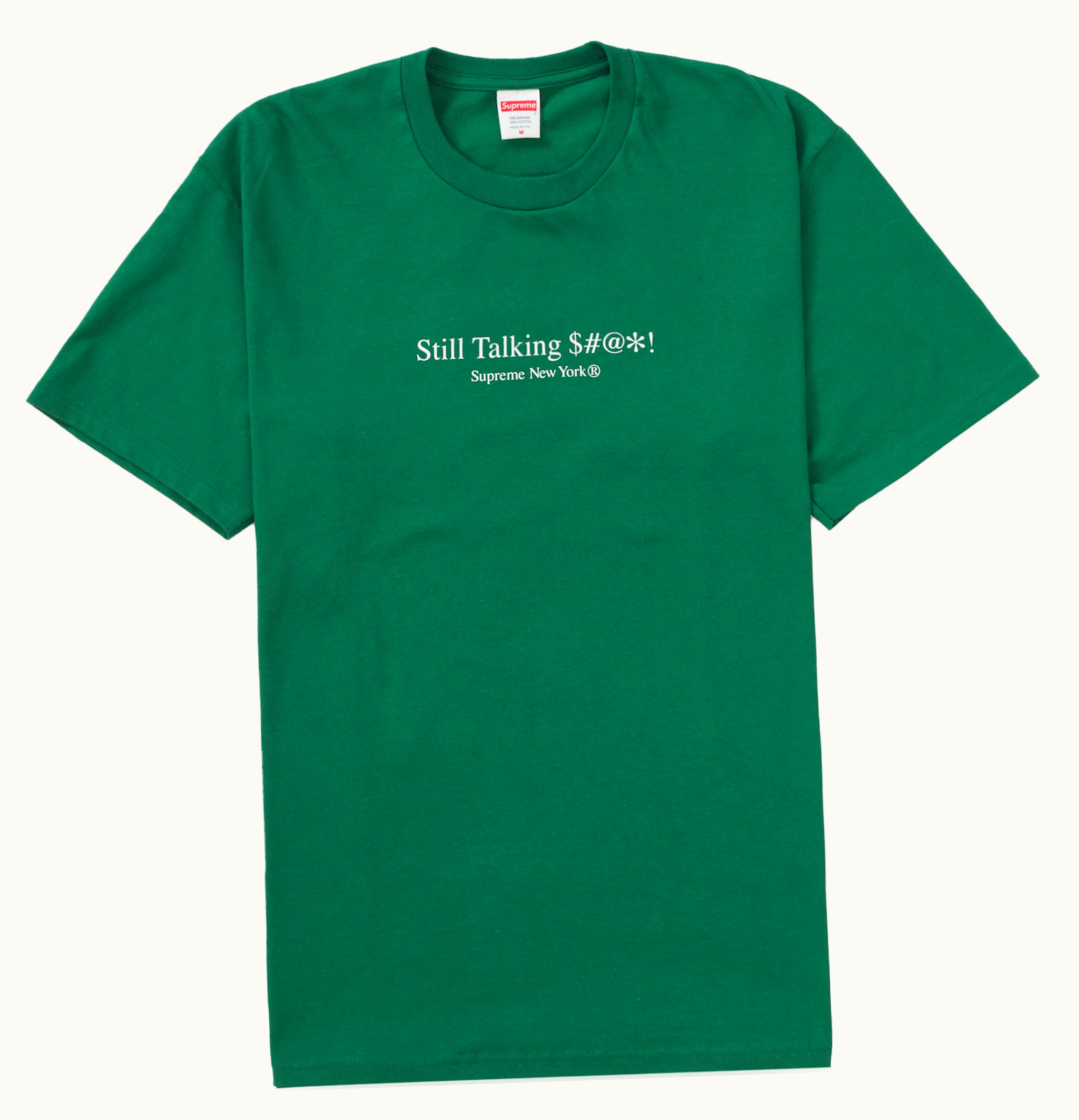 Supreme Still Talking Still Talking is a limited-edition T-shirt from the streetwear brand Supreme. The shirt features a graphic of a microphone with the words "Still Talking" repeated multiple times in bold, white lettering against a black background. The shirt is made from 100% cotton and features a ribbed crewneck collar, short sleeves, and a regular fit. This T-shirt is a must-have for fans of Supreme and streetwear enthusiasts who are looking for a statement piece to add to their wardrobe.