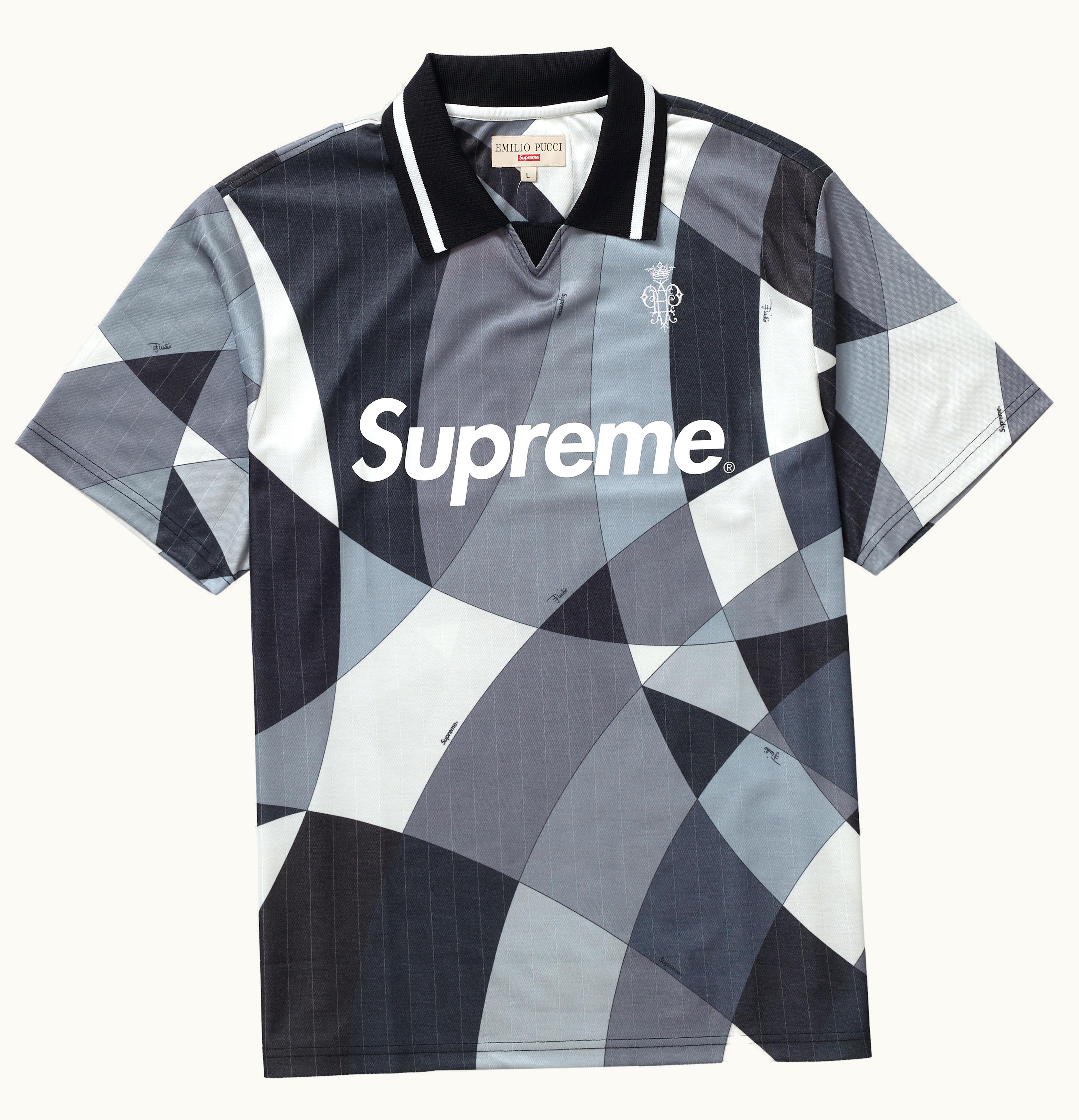 In June 2021, Supreme and Emilio Pucci teamed up for the first time to release over 40 new items, including Box Logo T-shirts, Zippos, and this Soccer Jersey, among others. The collaboration, which was part of Week 16 of Supreme's Spring/Summer 2021 season, marked a significant milestone for the two fashion powerhouses. <br> <br> Featuring an eye-catching Emilio Pucci print all over, this Supreme Soccer Jersey is one of the many standout pieces from their joint collection. The jersey also boasts a Supreme Logo across the chest and an Emilio Pucci Crest on the upper left torso for an added touch of branding. <br> <br> This Supreme Emilio Pucci Soccer Jersey hit the market on June 10th, 2021, with a retail price of $148 USD. Those looking to purchase it can head to GLINT, which is a trusted online platform for fashion-focused buyers and sellers.