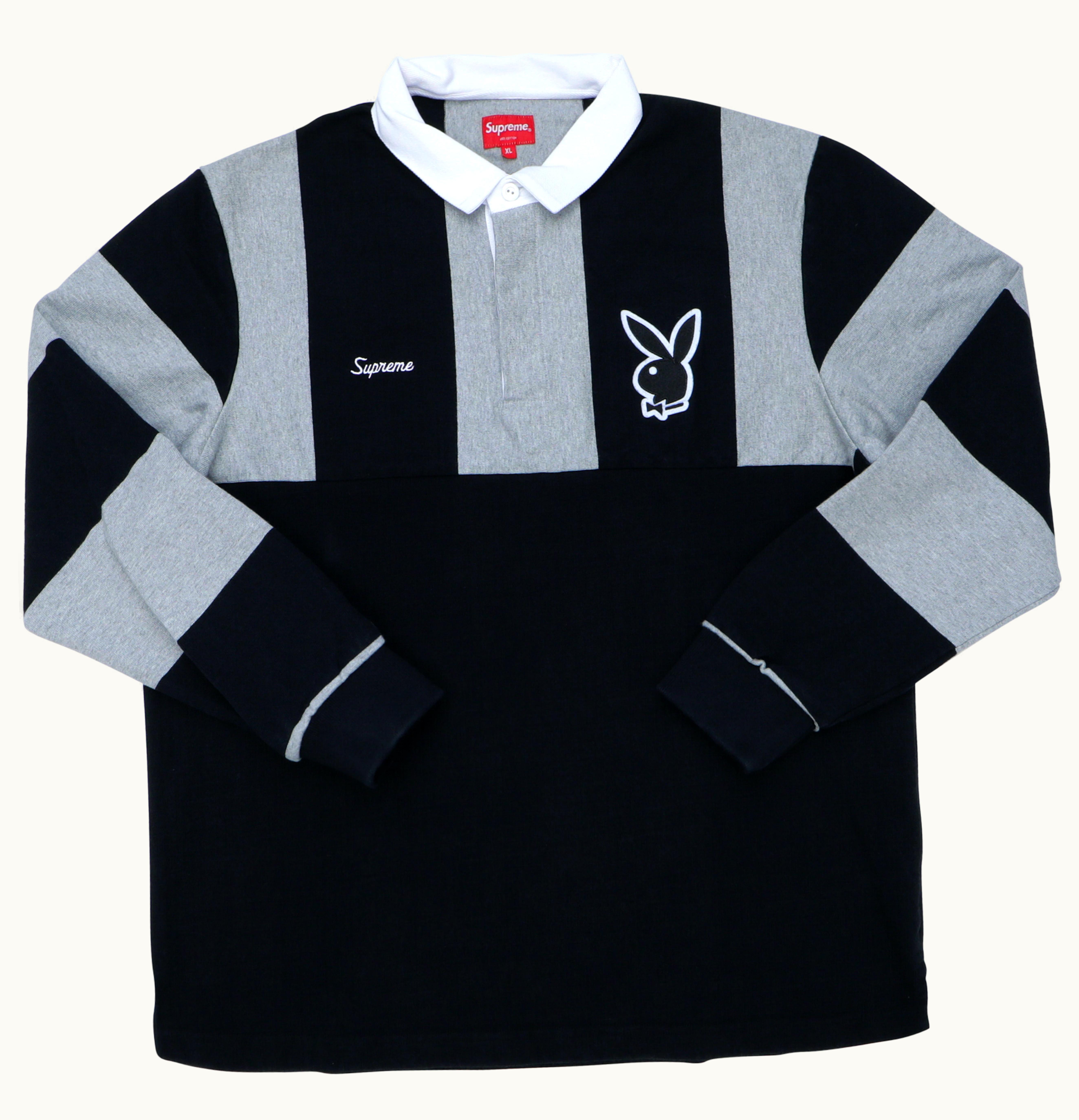 Supreme Playboy is a limited edition collaboration between Supreme and Playboy, two iconic brands in the streetwear and entertainment industries. The product is a cotton t-shirt with the Supreme box logo on the front and a classic Playboy magazine cover on the back, featuring a bunny rabbit and the iconic Playboy logo. The shirt comes in classic black and white colors and is available in various sizes. This collaboration combines the edgy and rebellious style of Supreme with the playful and glamorous aesthetic of Playboy. The result is a unique and eye-catching piece that is perfect for any streetwear or fashion enthusiast looking for a statement piece with a touch of retro flair.