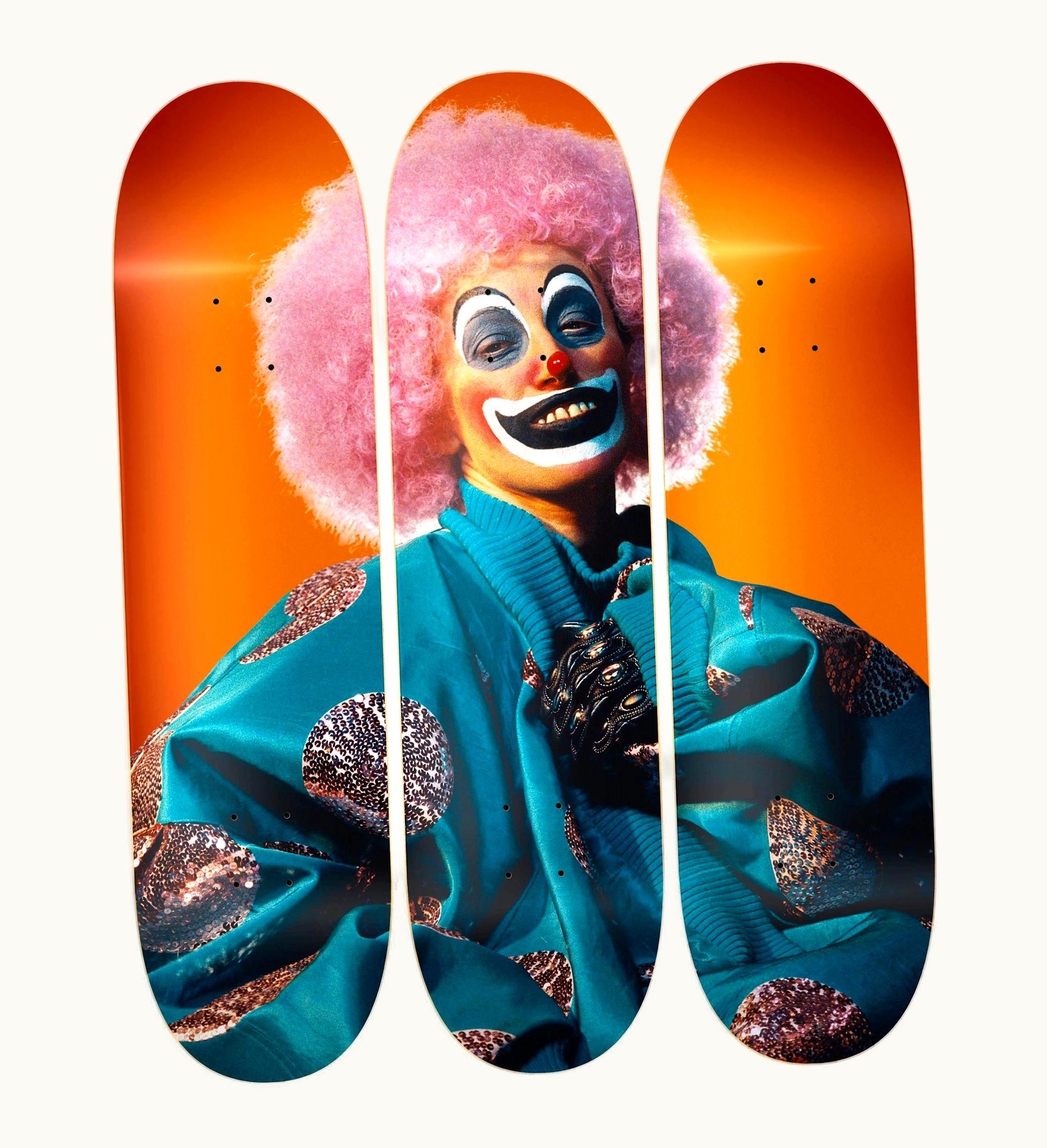 The Skateroom Cindy Sherman - Untitled #414 (Clown), 2003 is a professionally printed skateboard deck featuring an iconic artwork by renowned artist Cindy Sherman. The artwork depicts a clown in full costume and makeup, with dramatic, exaggerated features. Created in 2003, this piece is a part of Sherman's larger body of work exploring the themes of identity, performance, and representation. The deck is made from high-quality Canadian maple wood, with a matte finish and a hard, durable surface. This skateboard is not only a beautiful piece of art but also fully functional for skating or display. The Skateroom is a socially responsible company that donates a portion of its profits to support social skate projects worldwide, making this purchase an investment in both art and social change.