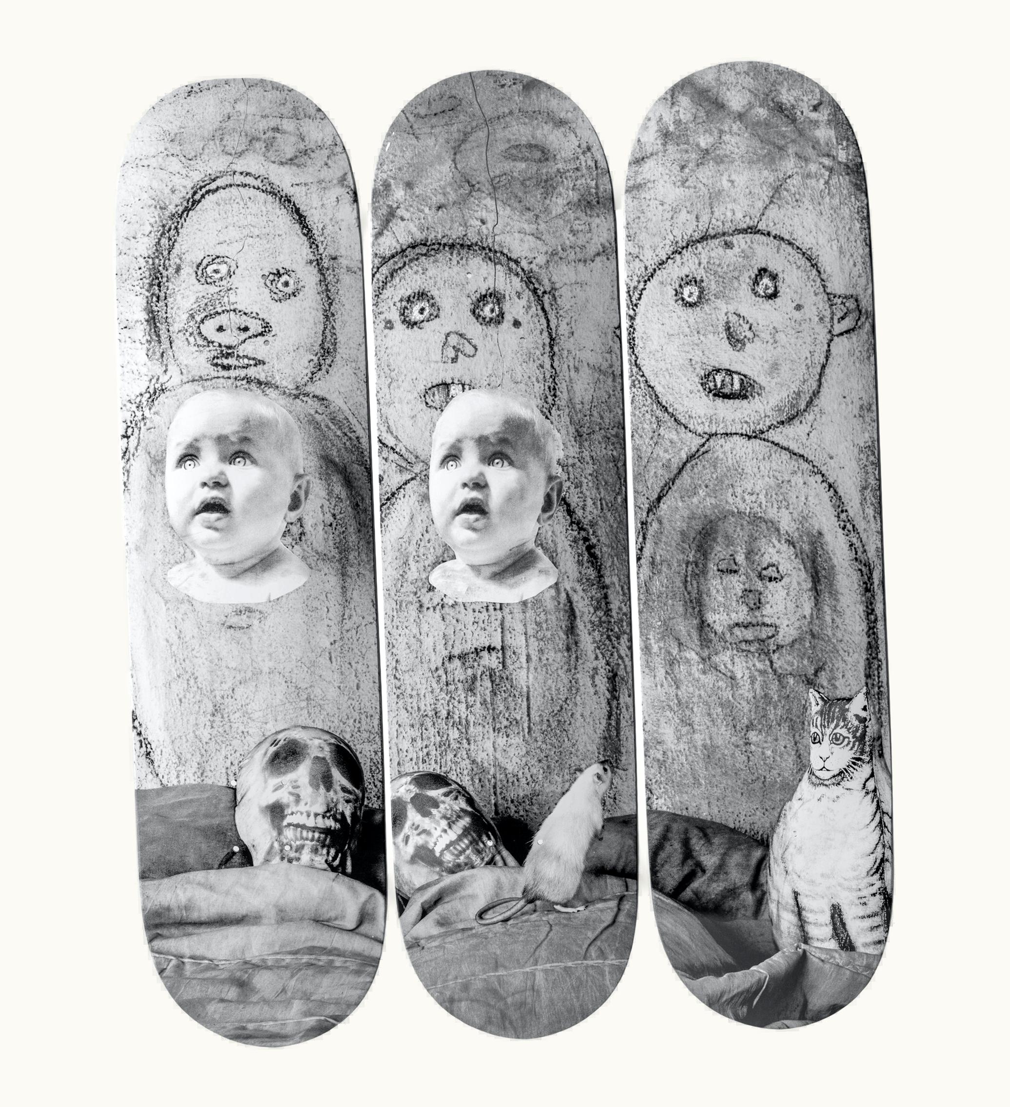 The Skateroom Roger Ballen - Beginning and Ending is a limited edition skateboard deck featuring the acclaimed photography of Roger Ballen. Printed on seven-ply Canadian maple wood, the deck showcases dual images from Ballen's iconic photography series, "Outland" and "Boarding House." The deck is adorned with custom silk-screen graphics and comes with a wall mount for display purposes. The Skateroom is a socially responsible brand that uses art and skateboarding as a means to support social projects around the world. Proceeds from the sale of this deck are donated to the Skateistan organization, which empowers children through education and skateboarding in Afghanistan, Cambodia, and South Africa.