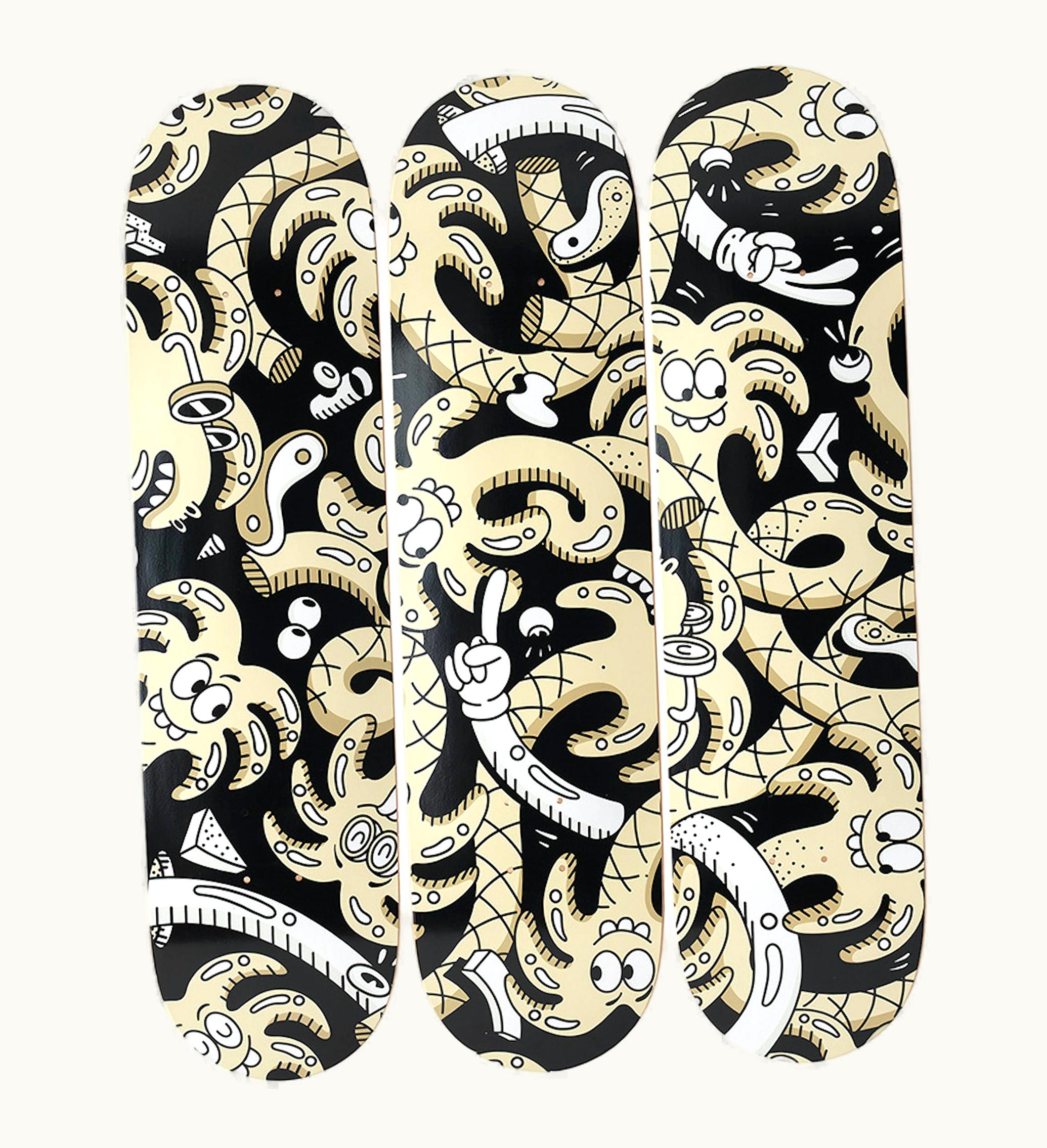 The Skateroom Steve Harrington - Rosé is a limited edition skateboard deck featuring the signature artwork of contemporary artist Steve Harrington. Measuring 31 x 8 inches, this deck is made of 7-ply Canadian maple and comes with a wall mount for easy display. The artwork depicts a playful and colorful interpretation of a wine bottle and glass, with Harrington's signature psychedelic-inspired imagery. This deck is a unique and stylish addition to any art or skateboarding collection, and a portion of the profits from its sale will go towards supporting youth empowerment organizations.