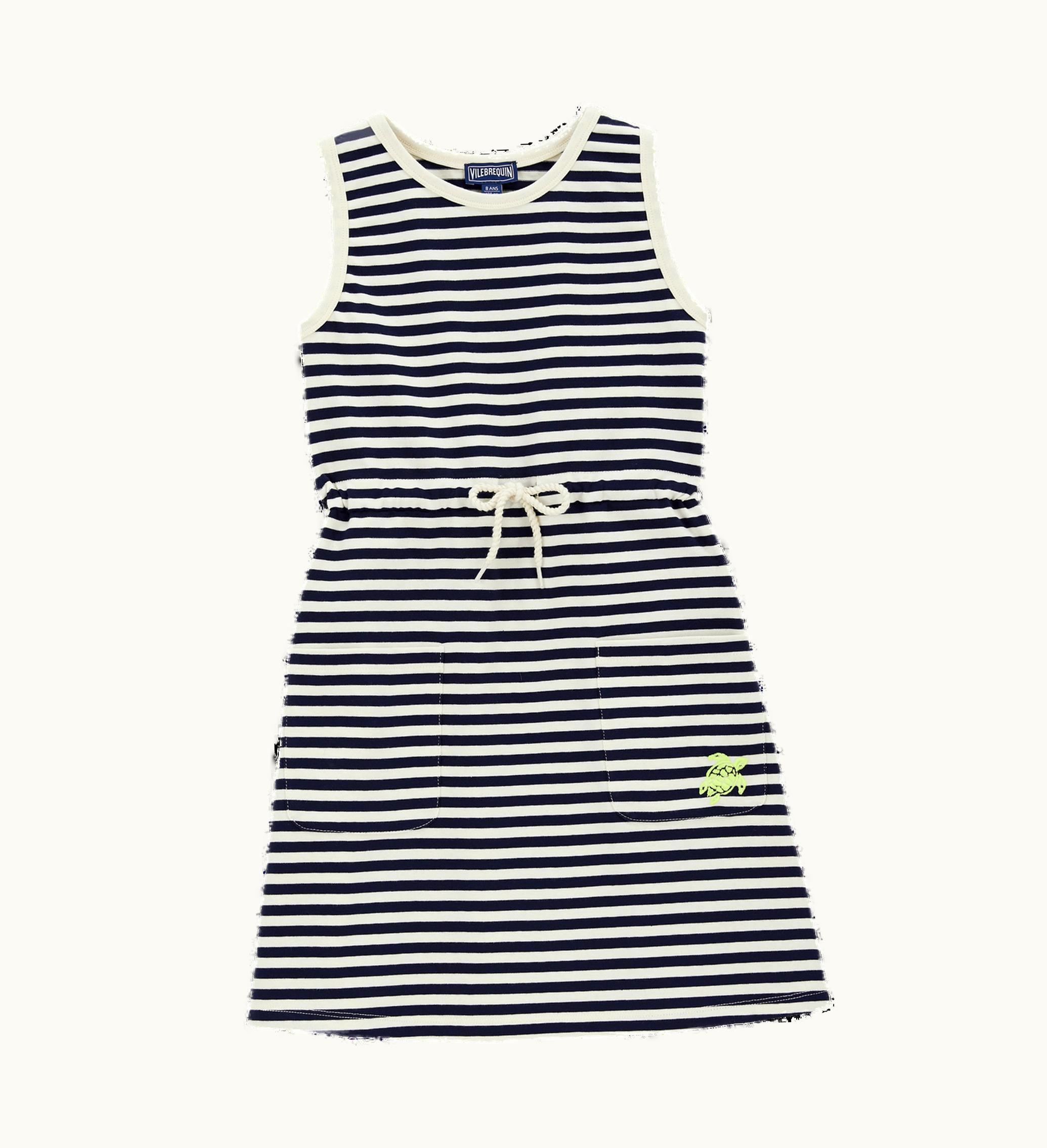Tank dressWaist cordTwo patch pocketsTurtle embroidery escaping from the pocketRound collarGirls DressGirls Dress 100% Organic Cotton