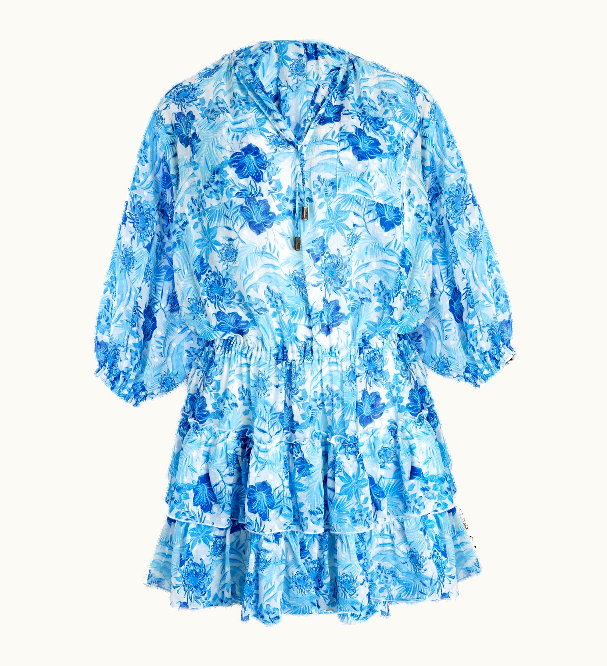 Short dress with ruffles, long sleevesNeckline with two drawstrings finished by tips like turtle scaleTurtle shell imitation Vilebrequin plateElastic waistTwo chest patch pocketsElastic at the bottom of the sleeveFront Length for a size S: 97.00cmMiddle back Length for a size S: 90.00cmThe model is 174cm tall and wears a size SWomen DressWomen Dress Tahiti Flowers100% Polyester