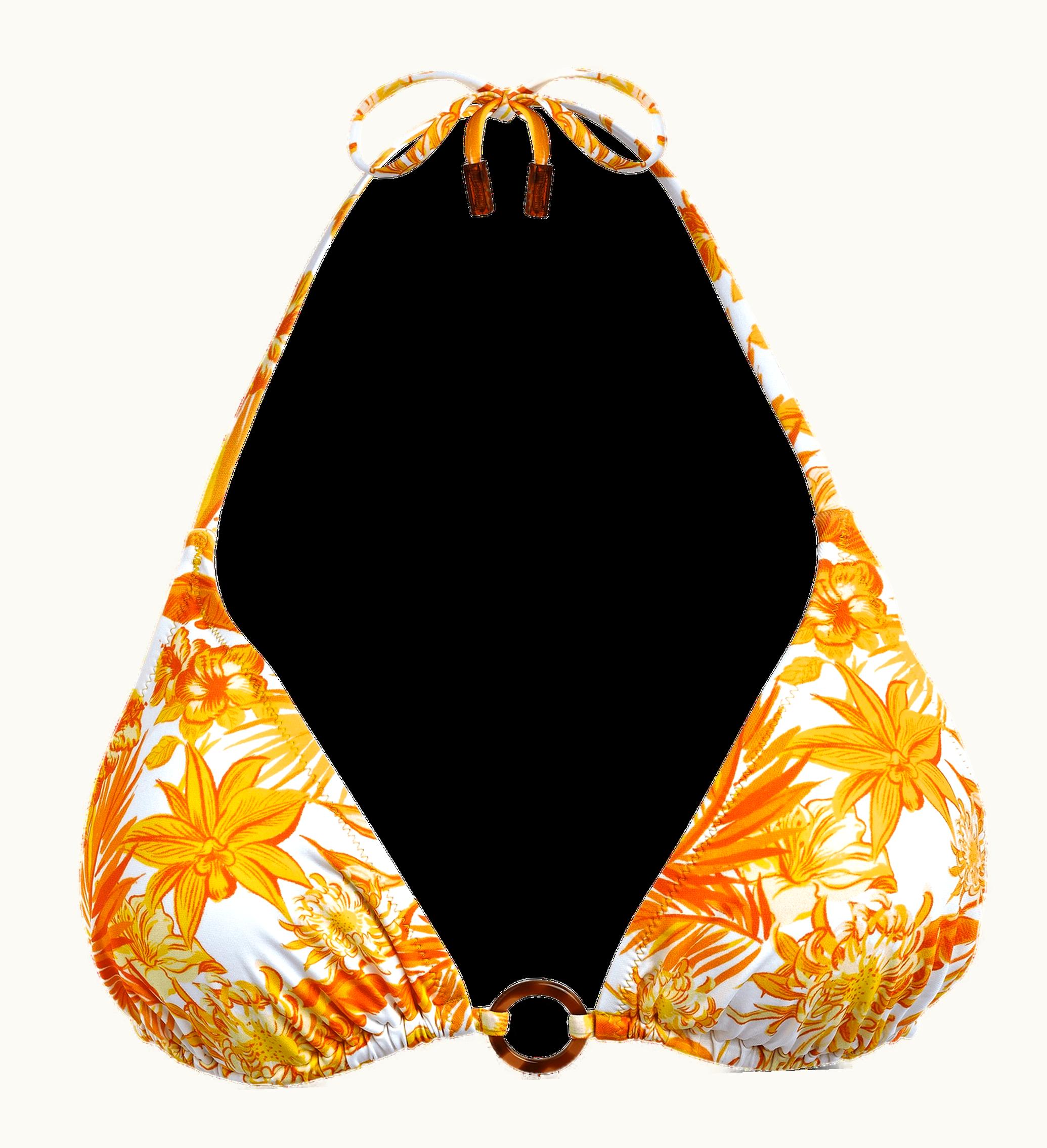 Triangle mini bikini topTo tie in the neck and backRing turtle scale like at the middle frontRemovable paddingsLinedThe model is 174cm tall and wears a size SWomen Bikini TopWomen Bikini Top Tahiti Flowers82% Recycled Polyamide - 18% Elastane