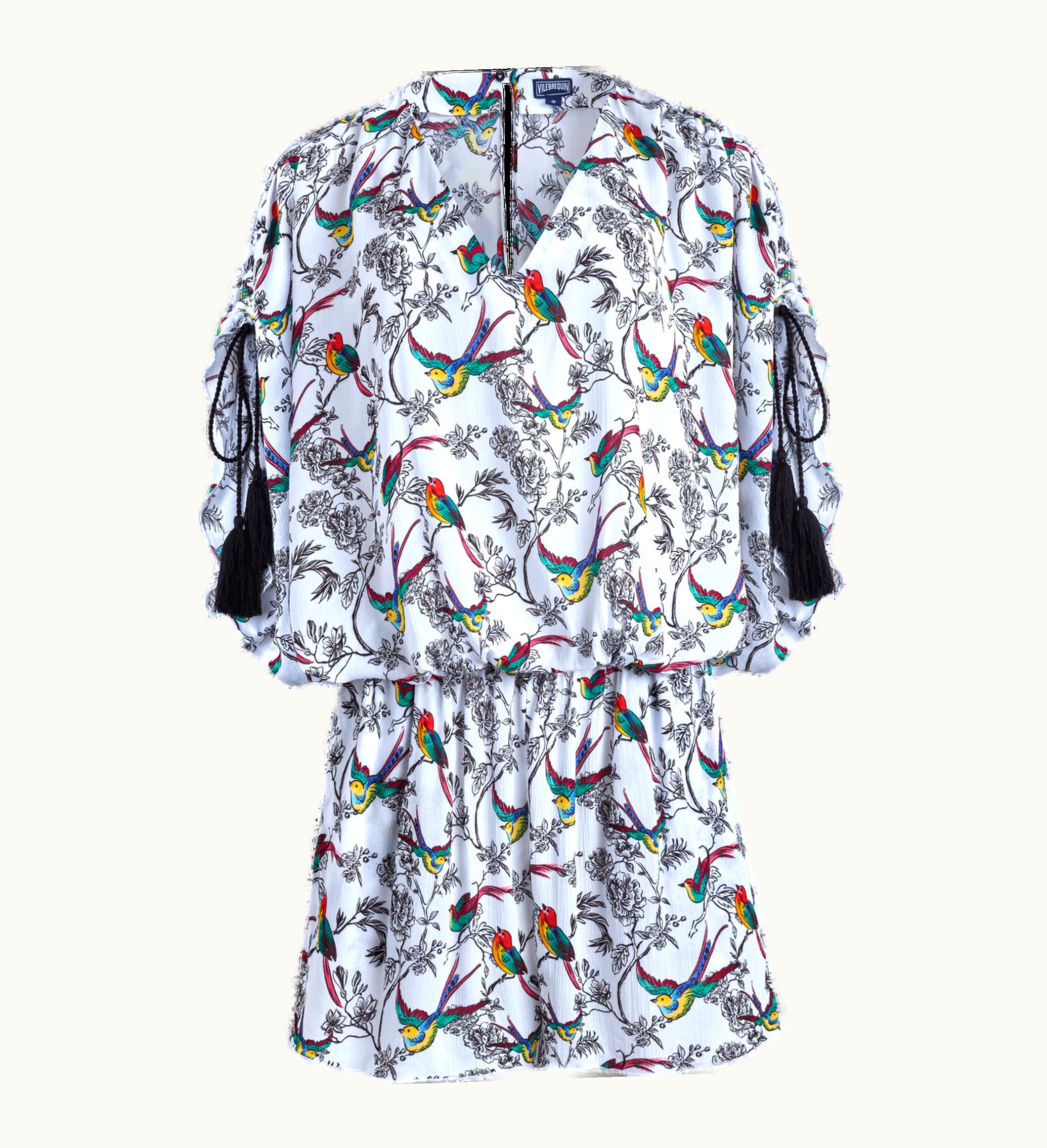 V-necklineElastic WaistBatwing SleevesTied with braided cords for adjustable sleeve height, decorated with tasselsBack neckline closed with a buttonViscose offers a cool sensation on the skin, ideal for hot weatherThe model is 178cm tall and wears a size SWomen PlaysuitWomen Playsuit Rainbow Birds100% Viscose